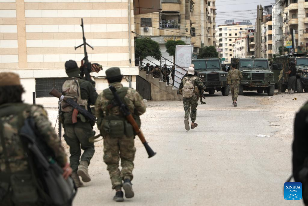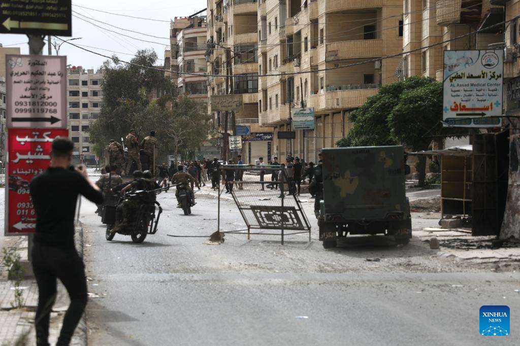 Syrian security forces are seen in the town of Ashrafiyat Sahnaya, southwest of Damascus, Syria, on April 30, 2025. (Str/Xinhua)