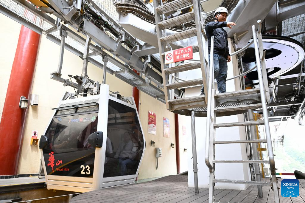 A maintenance worker conducts routine inspection at a cable car station at the Huashan Mountain scenic area in Weinan, northwest China's Shaanxi Province, April 29, 2025. Boasting precipitous cliffs and beautiful scenery, the Huashan Mountain has attracted a great number of visitors from around the world. With a maximal elevation difference of nearly 900 meters, the mountain's 4,211-meter-long sightseeing cableway has provided an unique travelling experience for tourists and gained popularity since its launch in 2013. For the smooth operation of the cableway, inspection of mechanical parts, electrical systems and communication equipment have become the routine work of maintenance workers every single day. As about 150,000 visits are expected to be made to Huashan during the upcoming May Day holiday, a total of 30 maintenance workers will be on duty to ensure the safe operation of the cableway. (Xinhua/Zhang Bowen)