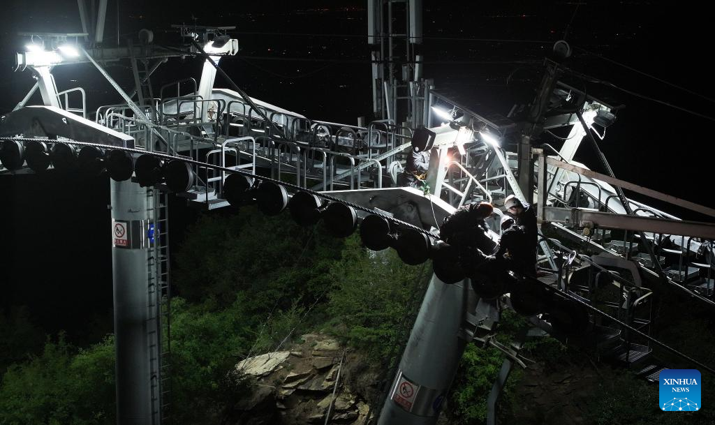A maintenance worker conducts routine inspection on the sightseeing cableway at the Huashan Mountain scenic area in Weinan, northwest China's Shaanxi Province, April 29, 2025. Boasting precipitous cliffs and beautiful scenery, the Huashan Mountain has attracted a great number of visitors from around the world. With a maximal elevation difference of nearly 900 meters, the mountain's 4,211-meter-long sightseeing cableway has provided an unique travelling experience for tourists and gained popularity since its launch in 2013. For the smooth operation of the cableway, inspection of mechanical parts, electrical systems and communication equipment have become the routine work of maintenance workers every single day. As about 150,000 visits are expected to be made to Huashan during the upcoming May Day holiday, a total of 30 maintenance workers will be on duty to ensure the safe operation of the cableway. (Xinhua/Zhang Bowen)