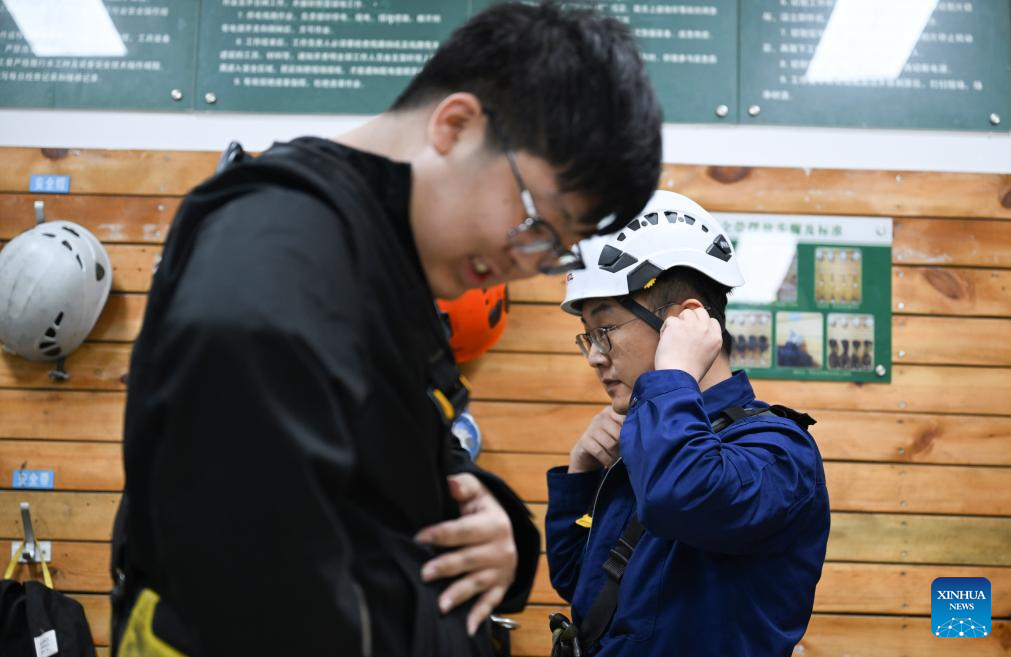 Maintenance workers put on protective equipment before conducting routine inspection at the Huashan Mountain scenic area in Weinan, northwest China's Shaanxi Province, April 28, 2025. Boasting precipitous cliffs and beautiful scenery, the Huashan Mountain has attracted a great number of visitors from around the world. With a maximal elevation difference of nearly 900 meters, the mountain's 4,211-meter-long sightseeing cableway has provided an unique travelling experience for tourists and gained popularity since its launch in 2013. For the smooth operation of the cableway, inspection of mechanical parts, electrical systems and communication equipment have become the routine work of maintenance workers every single day. As about 150,000 visits are expected to be made to Huashan during the upcoming May Day holiday, a total of 30 maintenance workers will be on duty to ensure the safe operation of the cableway. (Xinhua/Zhang Bowen)