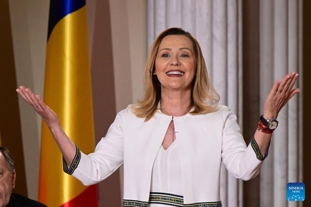 Lavinia Sandru, candidate for Romania's presidency, speaks during an electoral debate organised by Romania's state television channel at the Cotroceni palace in Bucharest, Romania, April 29, 2025. Romanians will vote in the first round of presidential elections on May 4. (Photo by Cristian Cristel/Xinhua)