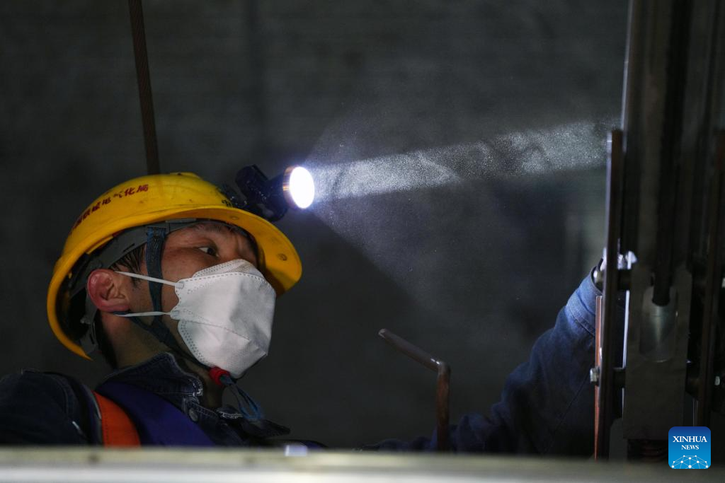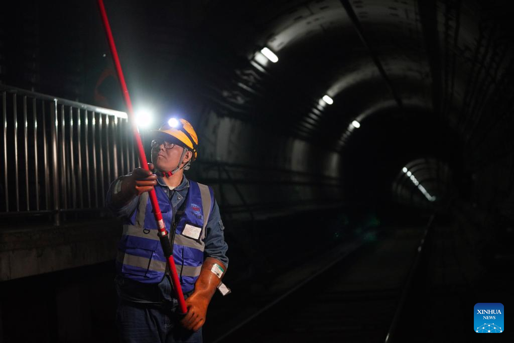 In the stillness of the night, these maintenance workers work industriously through the underground tunnels, ensuring the stable operation of the metro power supply. (Xinhua/Wang Song)