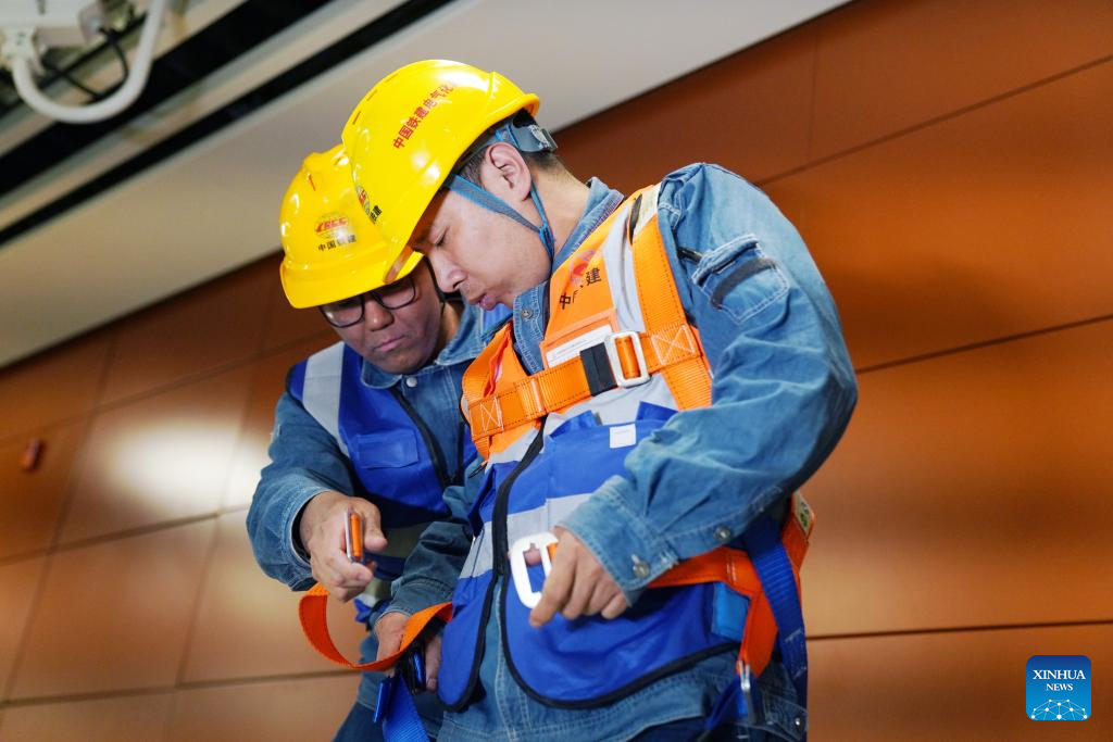 Maintenance worker He Nao (R) wears a safety device at a station of Metro Line 2 in Harbin, northeast China's Heilongjiang Province, April 29, 2025.(Xinhua/Wang Song)