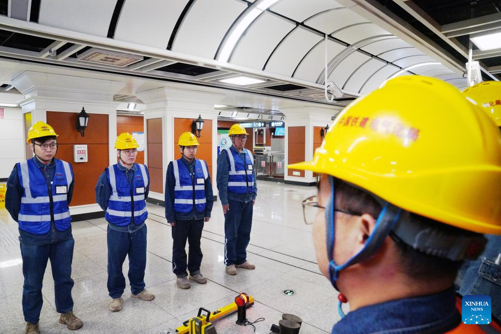 Maintenance workers patrol at a station of Metro Line 2 in Harbin, northeast China's Heilongjiang Province, April 30, 2025.(Xinhua/Wang Song)