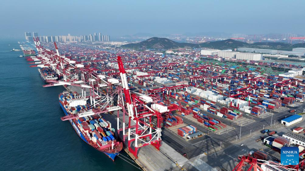 An aerial drone photo taken on April 30, 2025 shows cargo ships berthing at a container dock of Qingdao Port in Qingdao, east China's Shandong Province. This year, Qingdao port has actively expanded its international shipping routes, especially for the Association of Southeast Asian Nations (ASEAN). The direct cargo shipping routes from Qingdao Port to the ASEAN countries has increased to 50, with the cargo volume from Qingdao to ASEAN countries up six percent year-on-year in the first quarter of this year. (Xinhua/Li Ziheng)