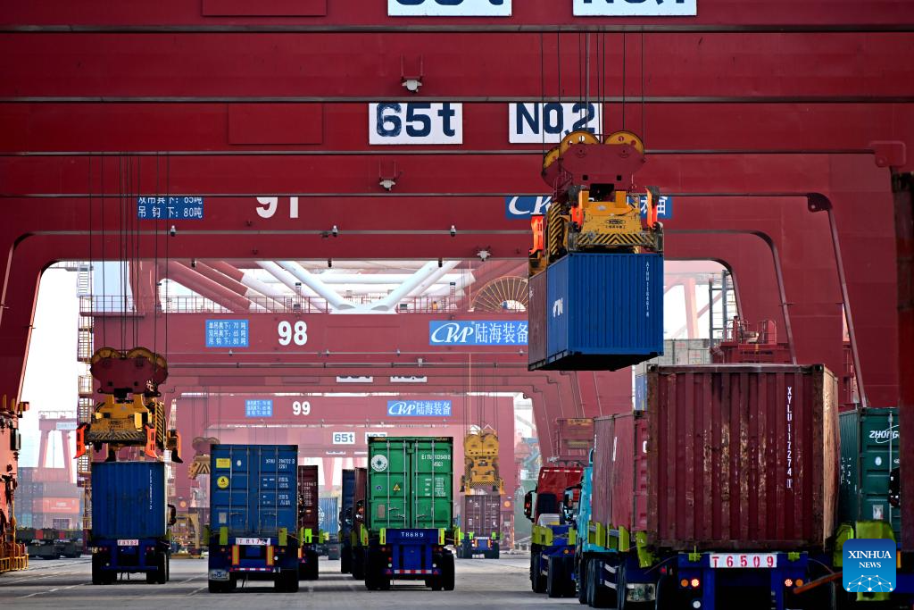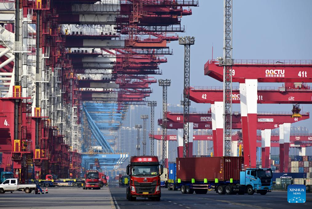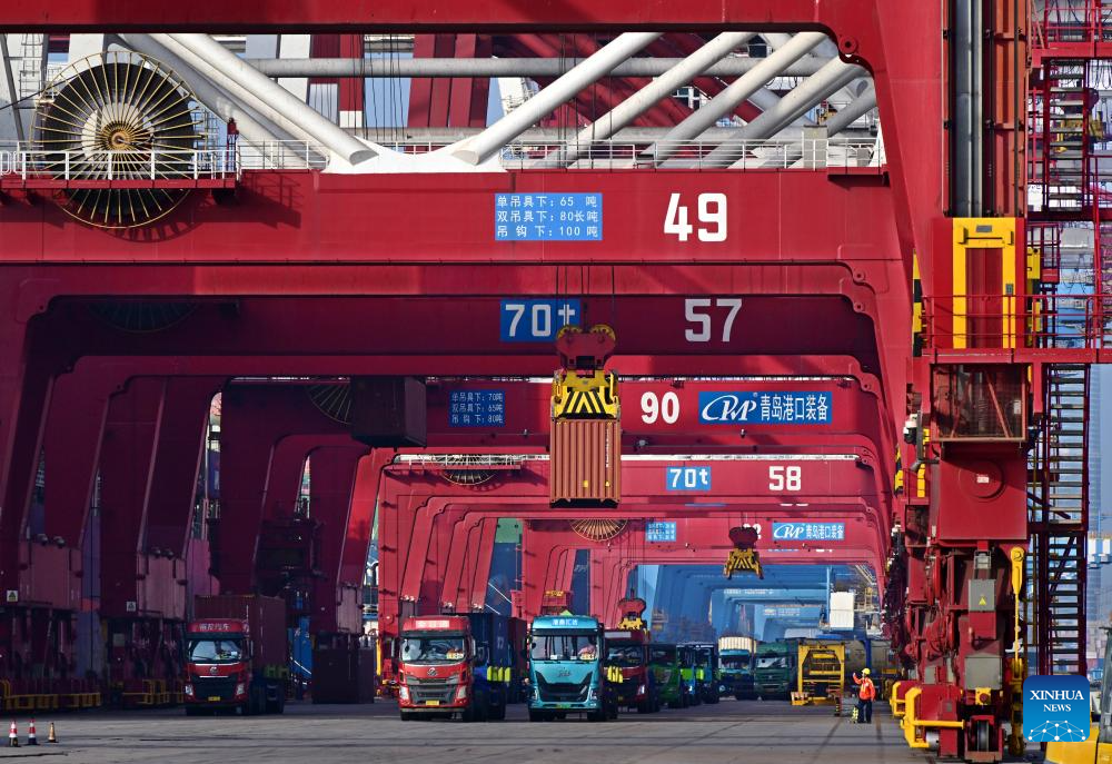 This photo taken on April 30, 2025 shows trucks at a container dock of Qingdao Port in Qingdao, east China's Shandong Province. This year, Qingdao port has actively expanded its international shipping routes, especially for the Association of Southeast Asian Nations (ASEAN). The direct cargo shipping routes from Qingdao Port to the ASEAN countries has increased to 50, with the cargo volume from Qingdao to ASEAN countries up six percent year-on-year in the first quarter of this year. (Xinhua/Li Ziheng)