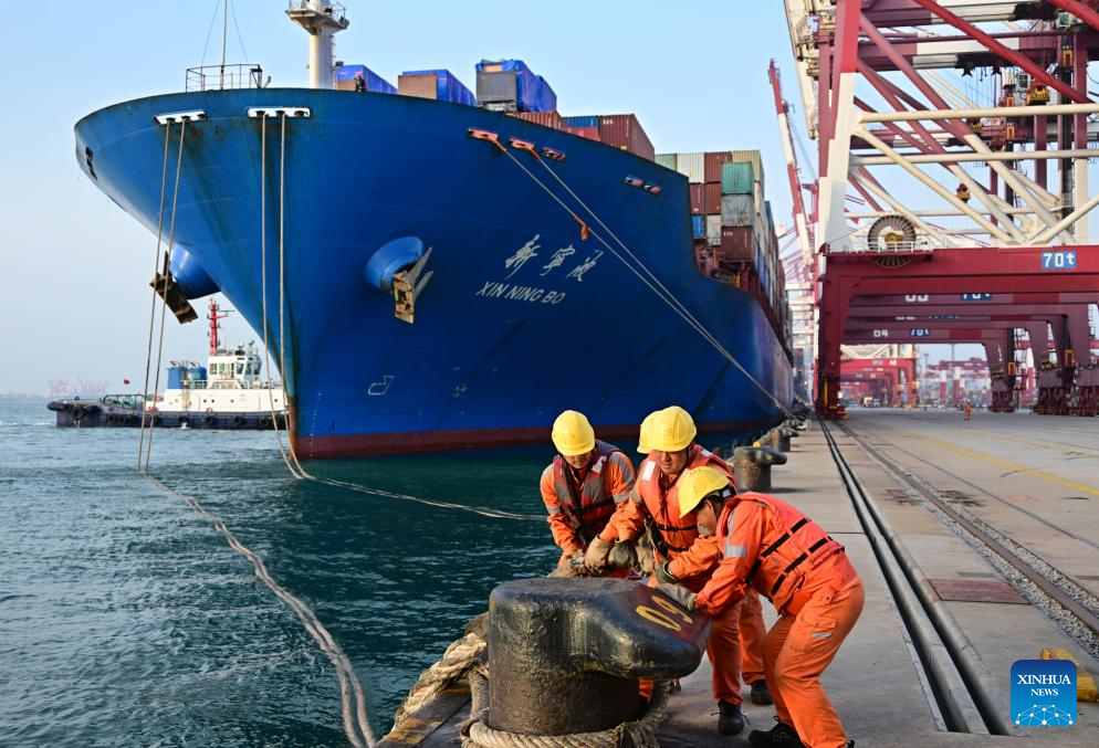 Workers prepare to cast off the ropes for a ship bound for ASEAN countries at a container dock of Qingdao Port in Qingdao, east China's Shandong Province, April 30, 2025. This year, Qingdao port has actively expanded its international shipping routes, especially for the Association of Southeast Asian Nations (ASEAN). The direct cargo shipping routes from Qingdao Port to the ASEAN countries has increased to 50, with the cargo volume from Qingdao to ASEAN countries up six percent year-on-year in the first quarter of this year. (Xinhua/Li Ziheng)