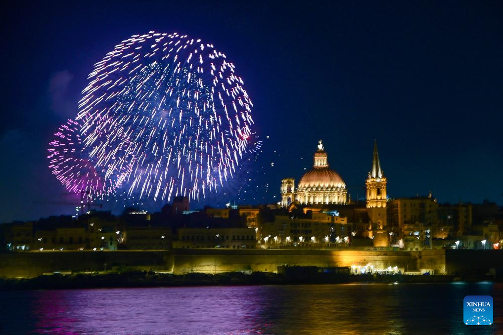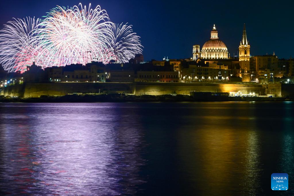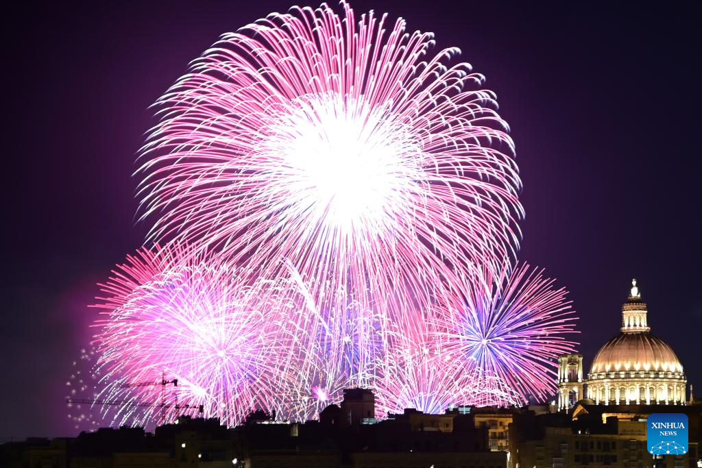 This photo taken on April 30, 2025 shows fireworks during the grand finale of the Malta International Fireworks Festival in Sliema, Malta. (Photo by Jonathan Borg/Xinhua)