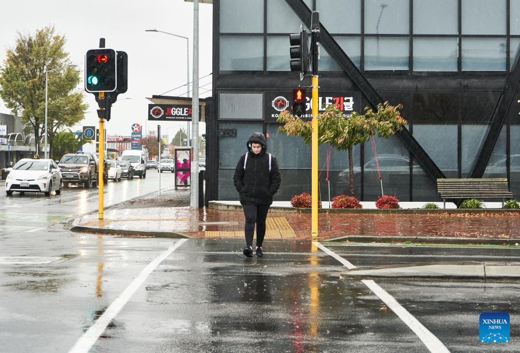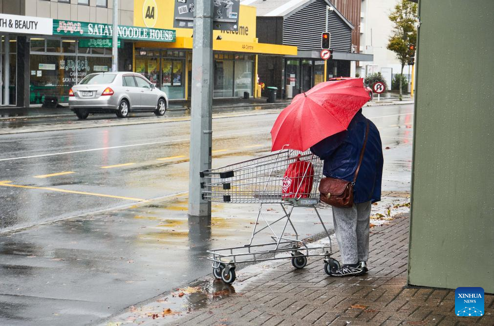 A pedestrian walks on a street in Christchurch, New Zealand, May 1, 2025. Severe weather has hit New Zealand on Thursday with a State of Emergency declared in part of the country. (Photo by Chen Siyumeng/Xinhua)