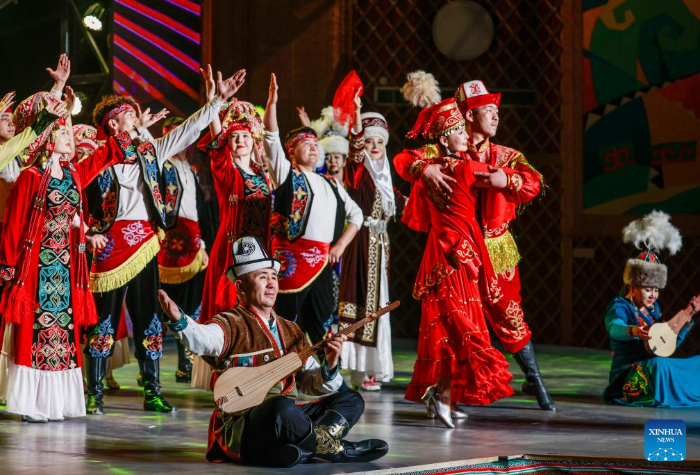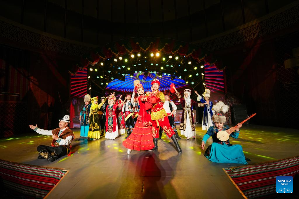 Artists perform the "Manas" epic at a local theater in Artux City, Kizilsu Kirgiz Autonomous Prefecture in northwest China's Xinjiang Uygur Autonomous Region, April 22, 2025.(Xinhua/Wang Fei)