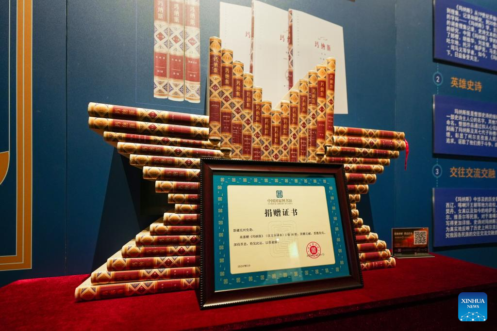 This photo taken on April 22, 2025 shows the Chinese version of "Manas" displayed at a local museum in Kirgiz Autonomous Prefecture of Kizilsu in northwest China's Xinjiang Uygur Autonomous Region.(Xinhua/Xu Hongyan)