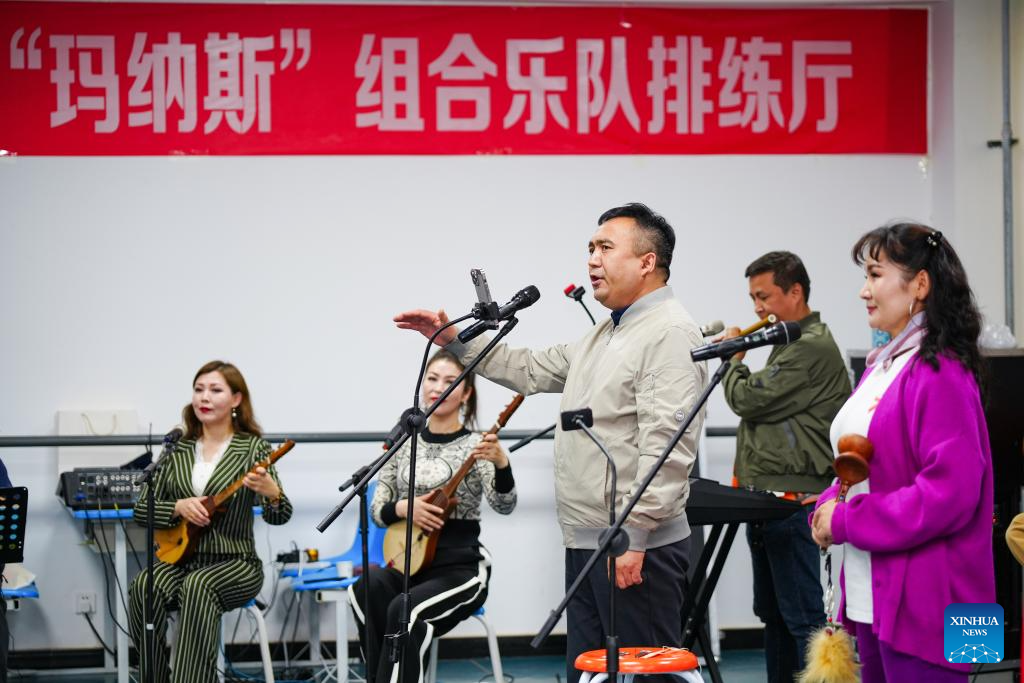 A band rehearses their adapted rock version of the "Manas" epic at a practice hall in Artux City, Kizilsu Kirgiz Autonomous Prefecture in northwest China's Xinjiang Uygur Autonomous Region, April 22, 2025.(Xinhua/Xu Hongyan)