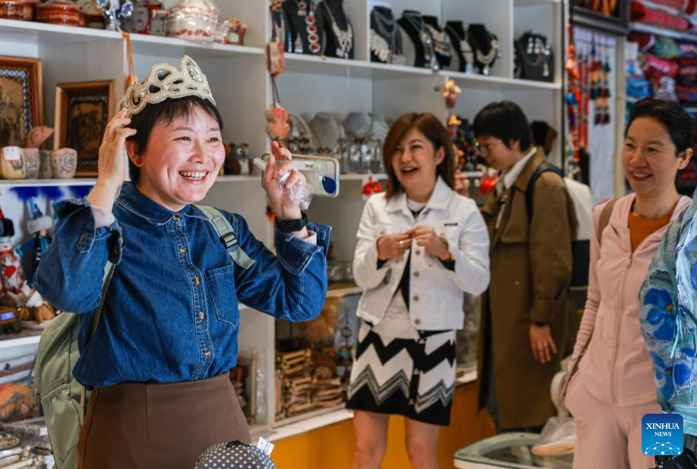 A tourist tries on ethnic costumes after a "Manas" epic show at a folklore park in Artux City, Kizilsu Kirgiz Autonomous Prefecture in northwest China's Xinjiang Uygur Autonomous Region, April 22, 2025.(Xinhua/Wang Fei)
