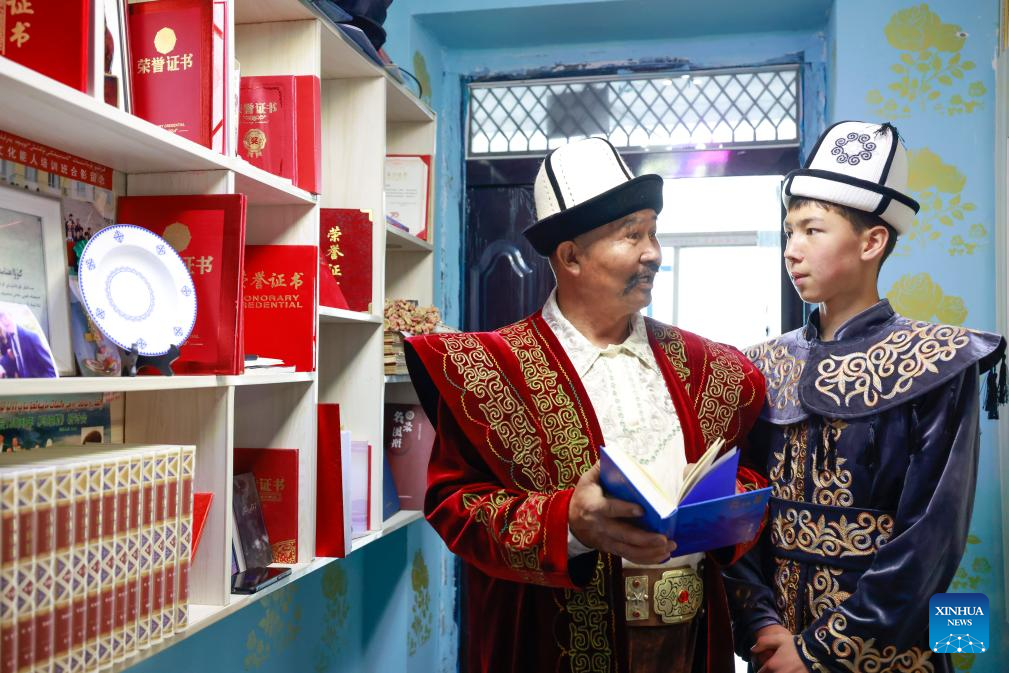Jannur Turganbay (L), a representative inheritor of the "Manas" epic, explains the history of "Manas" to his apprentice at his home in Artux City, Kizilsu Kirgiz Autonomous Prefecture in northwest China's Xinjiang Uygur Autonomous Region, April 21, 2025.(Xinhua/Wang Fei)