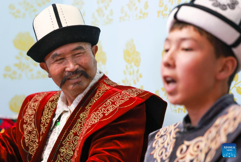 Jannur Turganbay (L), a representative inheritor of the "Manas" epic, teaches his apprentice to sing at his home in Artux City, Kizilsu Kirgiz Autonomous Prefecture in northwest China's Xinjiang Uygur Autonomous Region, April 21, 2025.(Xinhua/Wang Fei)