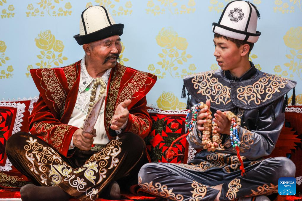 Jannur Turganbay (L), a representative inheritor of the "Manas" epic, teaches his apprentice to play self-made traditional instrument at his home in Artux City, Kizilsu Kirgiz Autonomous Prefecture in northwest China's Xinjiang Uygur Autonomous Region, April 21, 2025.(Xinhua/Wang Fei)
