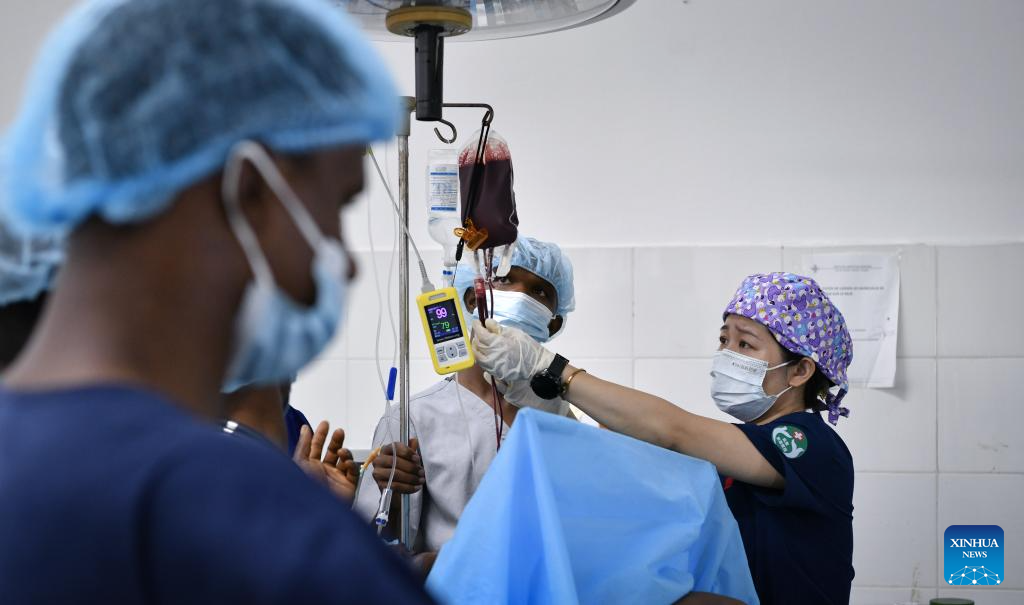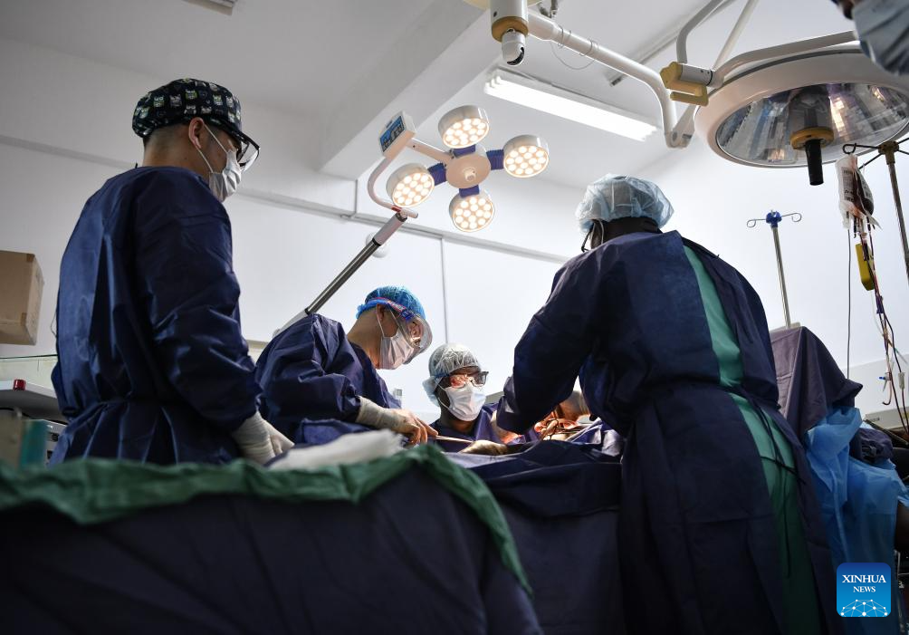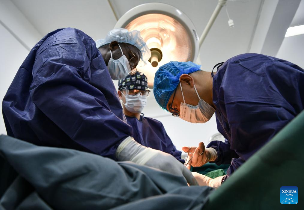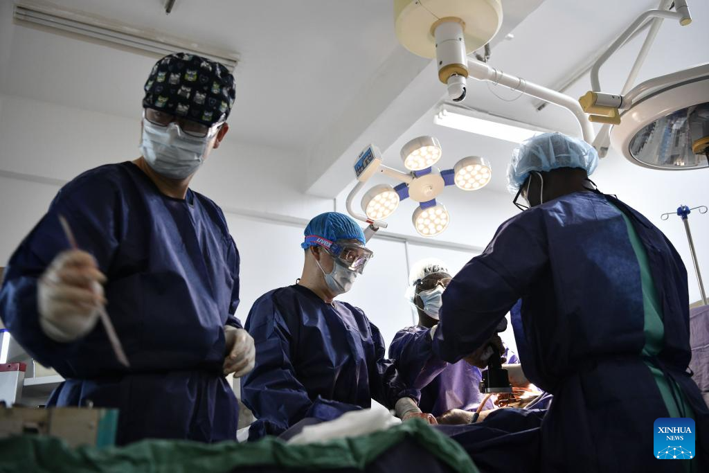 Chinese doctor Li Li (1st R) works in the operating room at Sino-Guinean Friendship Hospital in Conakry, Guinea, April 29, 2025.
