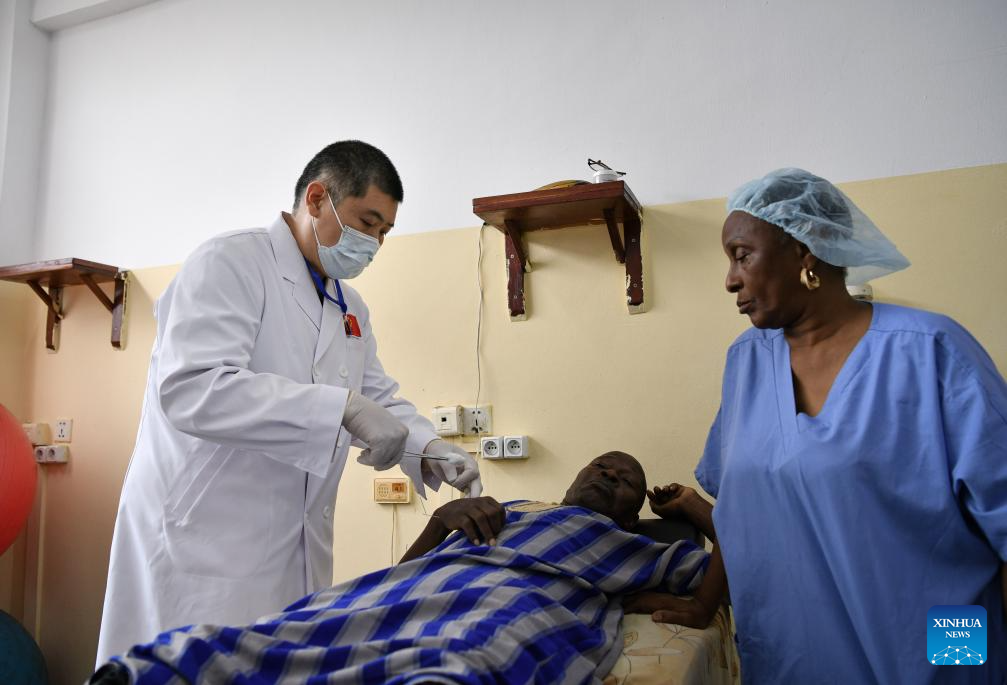 Chinese doctor Liu Luyao (L) performs acupuncture to a patient at Sino-Guinean Friendship Hospital in Conakry, Guinea, April 29, 2025.