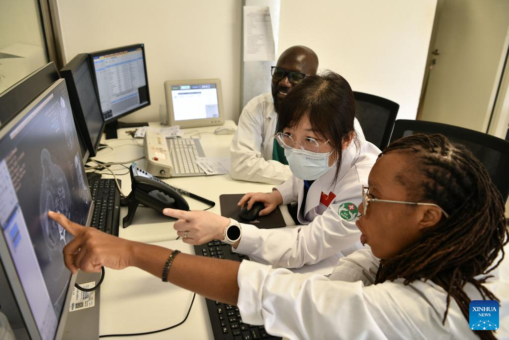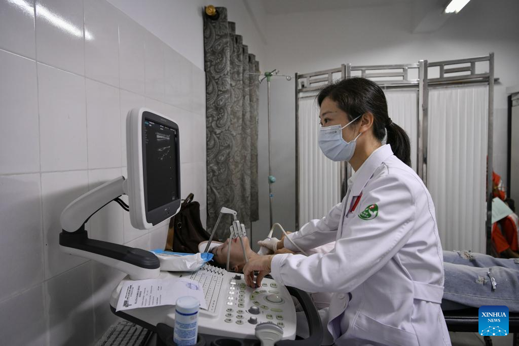 Chinese doctor Zhao Jing examines a patient through ultrasound scan at Sino-Guinean Friendship Hospital in Conakry, Guinea, April 29, 2025.