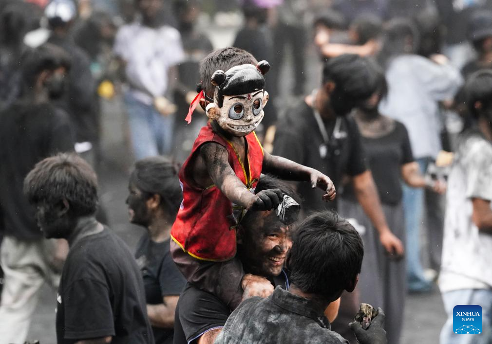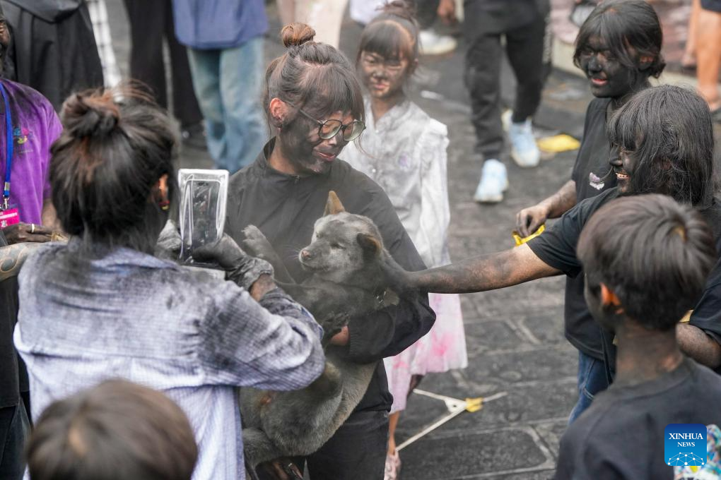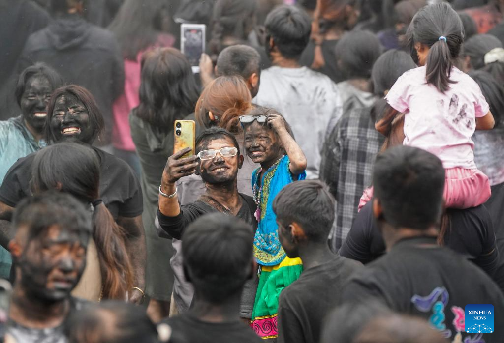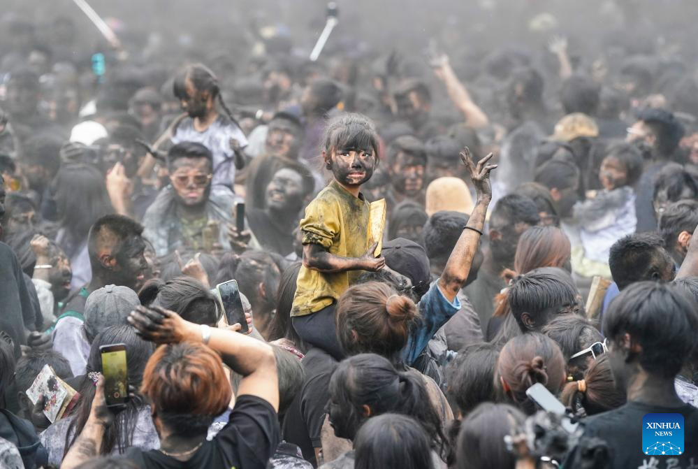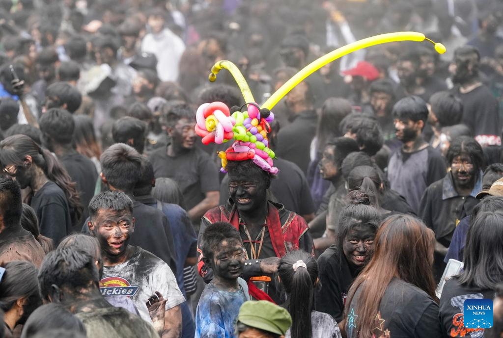 People take part in a folk event called "daubing face black" in Mojiang Hani Autonomous County of Pu'er City, southwest China's Yunnan Province, May 2, 2025. The traditional event is held here on Friday as people wish for good luck by daubing each others' faces black. (Xinhua/Chen Xinbo)