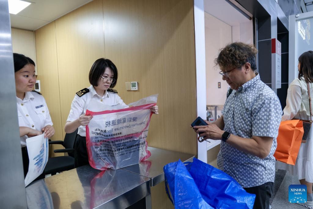 Tourists have their purchases checked at the Wenjindu port in Shenzhen, south China's Guangdong Province, April 30, 2025.