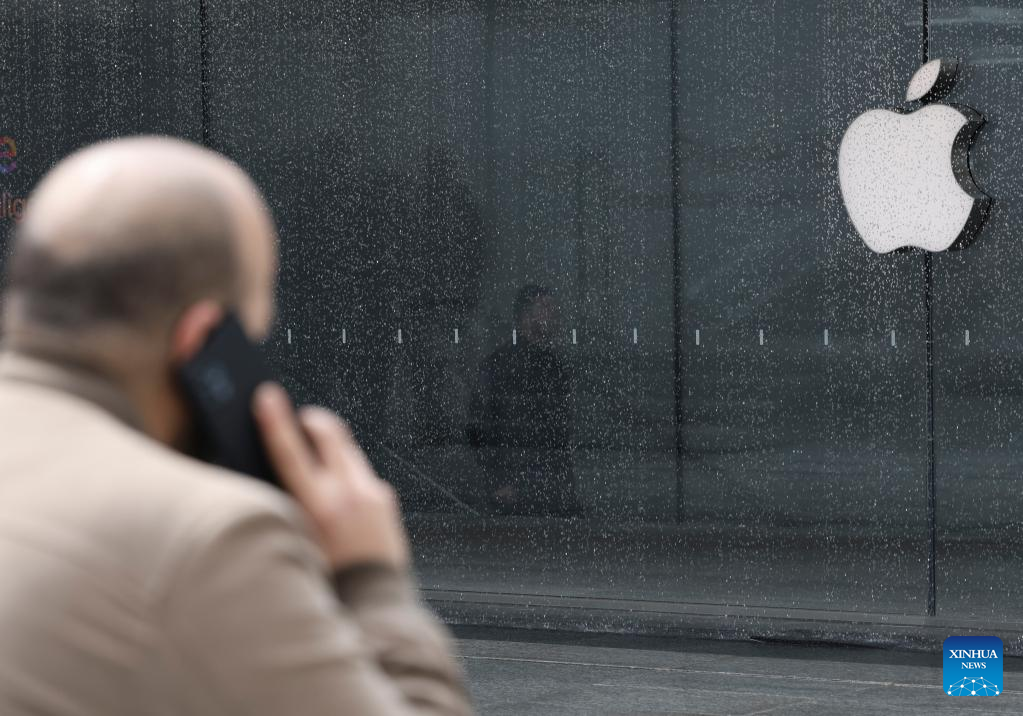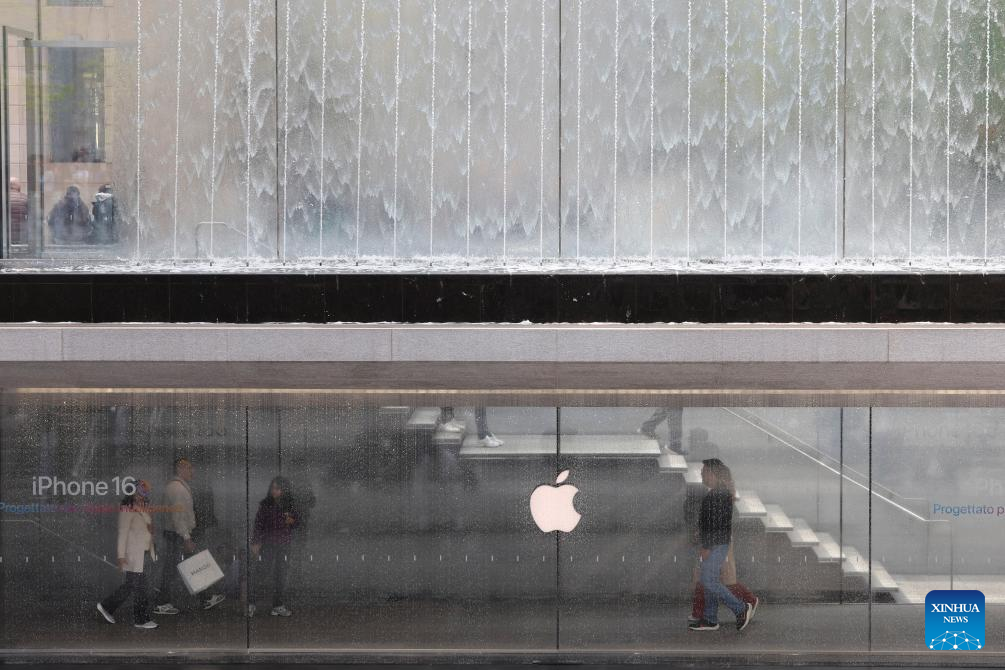 This photo taken on April 12, 2025 shows an Apple store in Milan, Italy. Apple on Thursday announced financial results for its fiscal 2025 second quarter ending March 29, with a quarterly revenue of 95.36 billion U.S. dollars, up 8 percent year over year.