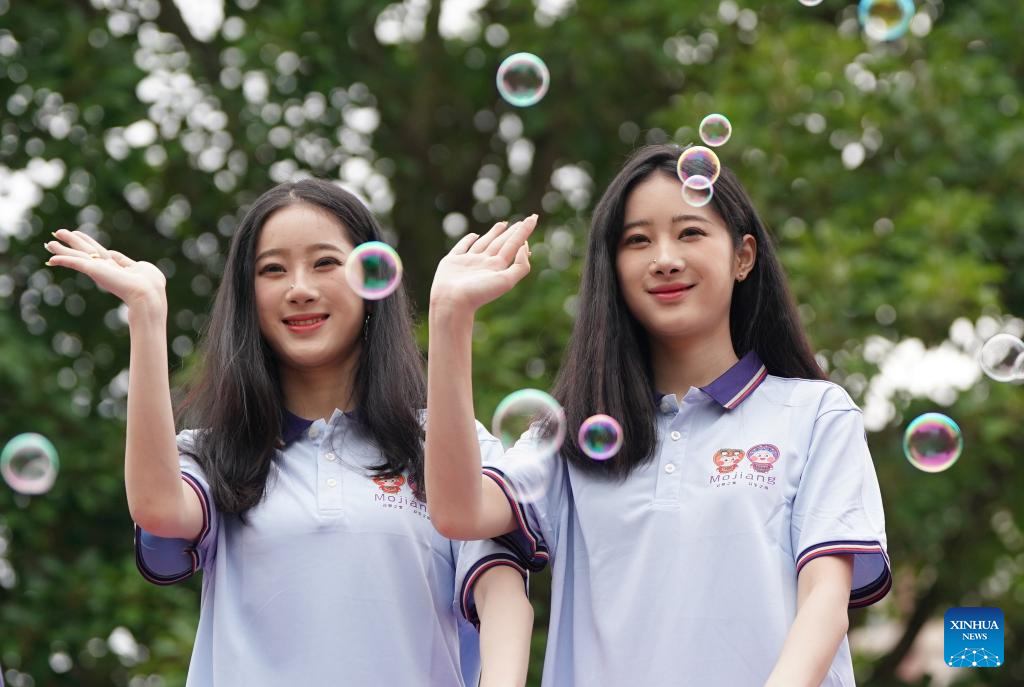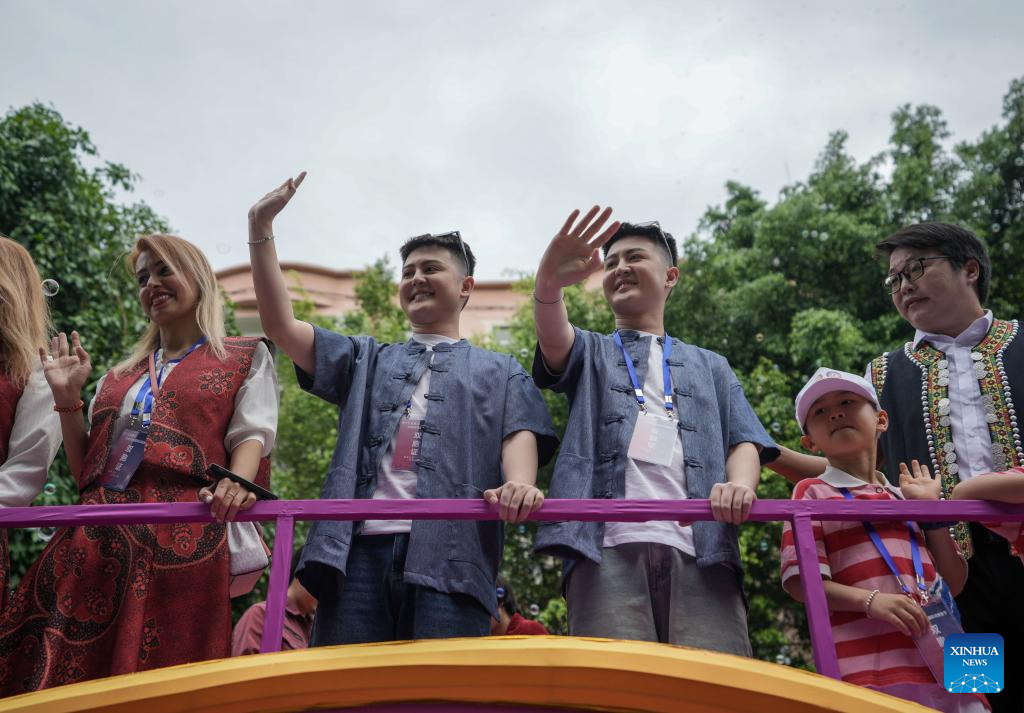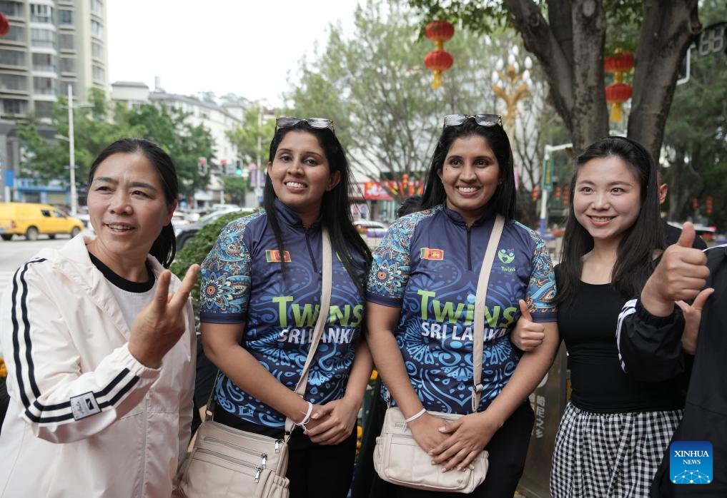 A pair of twins from Sri Lanka pose for group photos with citizens during the 19th Mojiang international twins festival in Mojiang Hani Autonomous County, southwest China's Yunnan province, May 1, 2025. Over 1,000 multiple births from around the world took part in a parade during the twins festival in Mojiang Hani Autonomous County on Thursday. (Xinhua/Chen Xinbo)