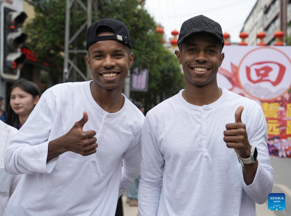A pair of twins from Chad are pictured during the 19th Mojiang international twins festival in Mojiang Hani Autonomous County, southwest China's Yunnan province, May 1, 2025. Over 1,000 multiple births from around the world took part in a parade during the twins festival in Mojiang Hani Autonomous County on Thursday. (Xinhua/Chen Xinbo)