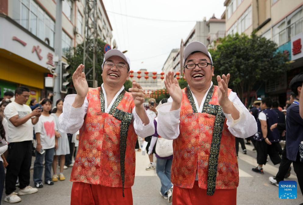 A pair of twins are pictured during the 19th Mojiang international twins festival in Mojiang Hani Autonomous County, southwest China's Yunnan province, May 1, 2025. Over 1,000 multiple births from around the world took part in a parade during the twins festival in Mojiang Hani Autonomous County on Thursday. (Xinhua/Chen Xinbo)