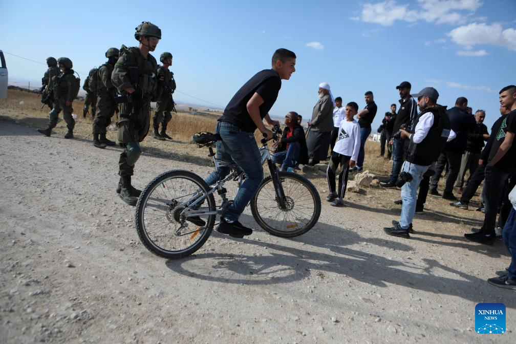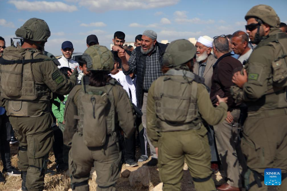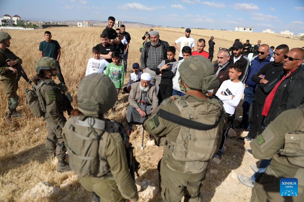 Israeli soldiers prevent Palestinians from accessing their lands in the ad-Dhahiriya, south of the West Bank city of Hebron, on May 2, 2025. (Photo by Mamoun Wazwaz/Xinhua)