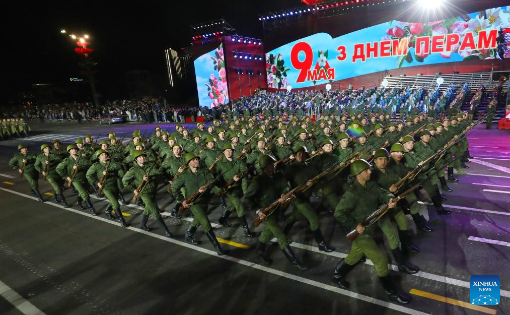 Performers attend a rehearsal for the Victory Day military parade in Minsk, capital of Belarus, May 2, 2025. (Photo by Henadz Zhinkov/Xinhua)