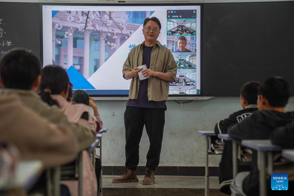 Li Runnan hosts an online lecture at a primary school in Wangu Village of Yanjin County, Zhaotong City, southwest China's Yunnan Province, April 29, 2025. (Photo by Peng Yikai/Xinhua)