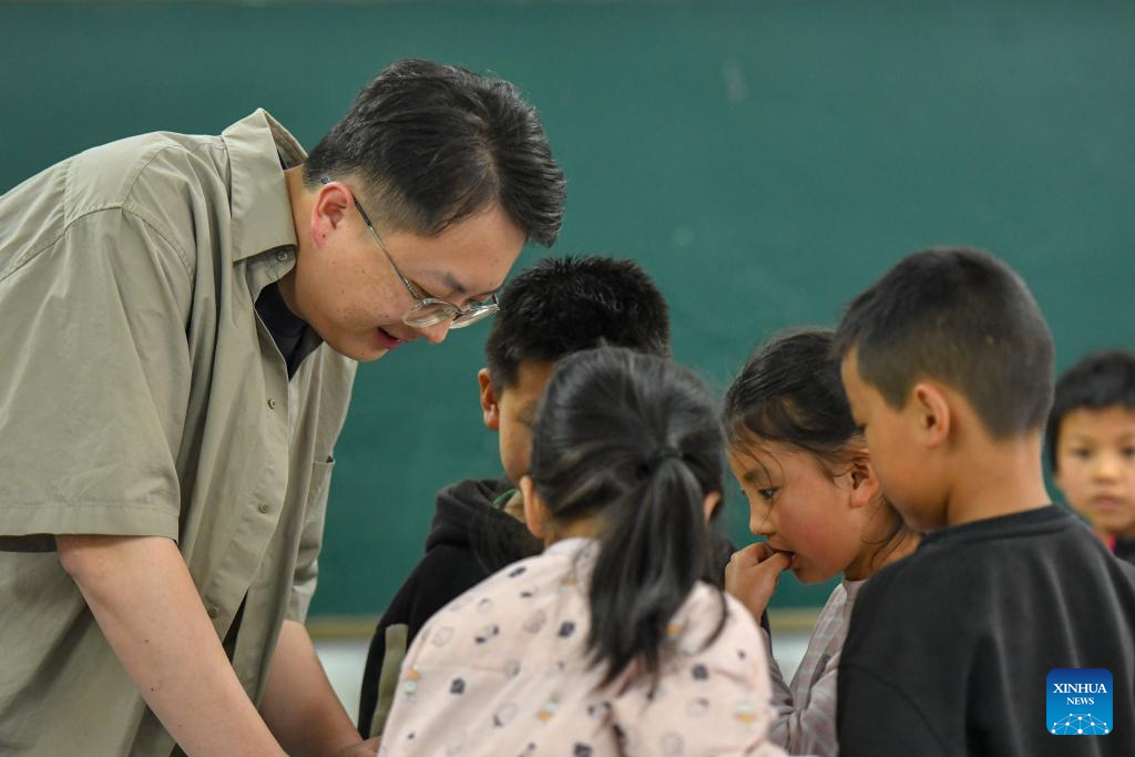 Li Runnan tutors students with homework at a primary school in Wangu Village of Yanjin County, Zhaotong City, southwest China's Yunnan Province, April 29, 2025. (Photo by Peng Yikai/Xinhua)