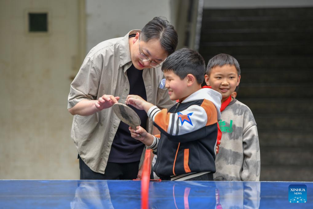 Li Runnan plays with children at a primary school in Wangu Village of Yanjin County, Zhaotong City, southwest China's Yunnan Province, April 29, 2025. (Photo by Peng Yikai/Xinhua)