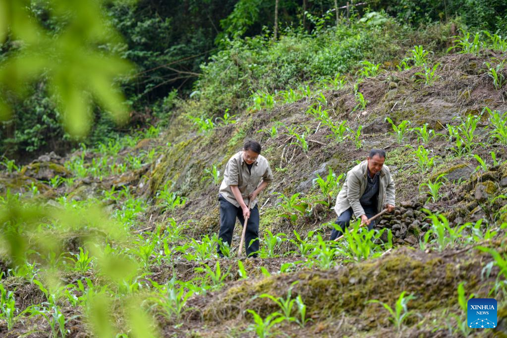 Li Runnan (L) works with a local villager in Wangu Village of Yanjin County, Zhaotong City, southwest China's Yunnan Province, April 30, 2025. (Photo by Peng Yikai/Xinhua)