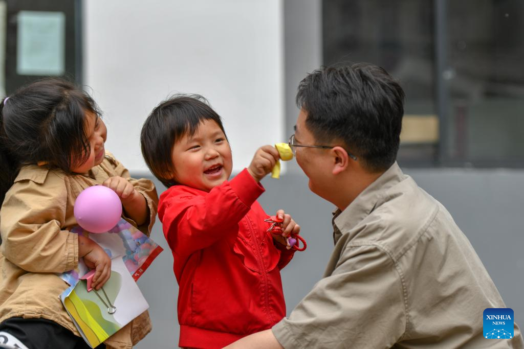 Li Runnan plays with children in Wangu Village of Yanjin County, Zhaotong City, southwest China's Yunnan Province, April 29, 2025. (Photo by Peng Yikai/Xinhua)