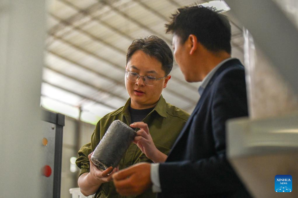 Li Runnan checks equipment with a staff member at a mushroom factory in Wangu Village of Yanjin County, Zhaotong City, southwest China's Yunnan Province, April 29, 2025. (Photo by Peng Yikai/Xinhua)