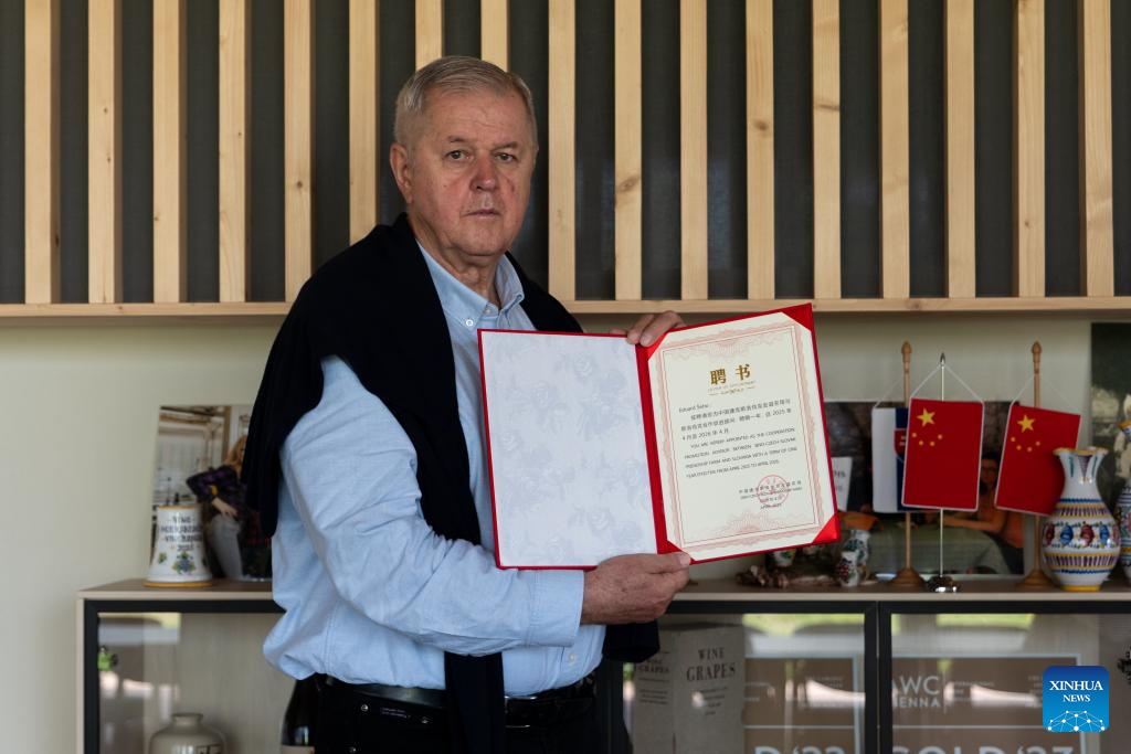 Eduard Sebo shows the letter of appointment as the cooperation promotion advisor for Slovakia from the Sino-Czech-Slovak friendship farm at his Shebo winery in Modra, Slovakia, April 23, 2025. (Photo by Peter Lahky/Xinhua)