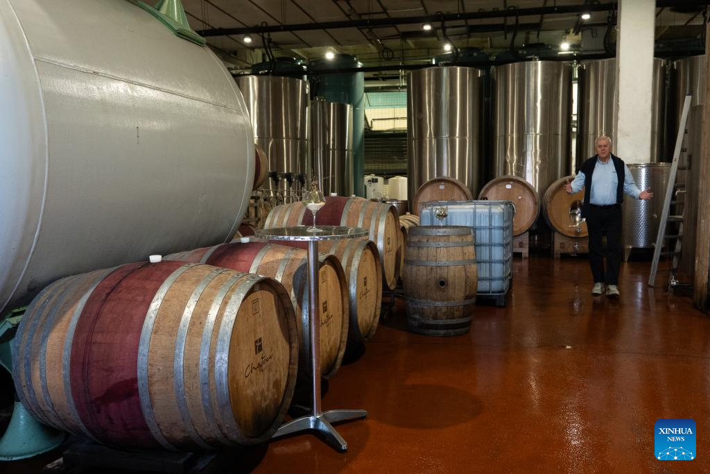 Eduard Sebo walks through the cellar at his Shebo winery in Modra, Slovakia, April 23, 2025. (Photo by Peter Lahky/Xinhua)