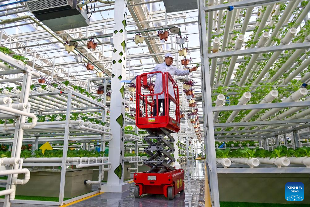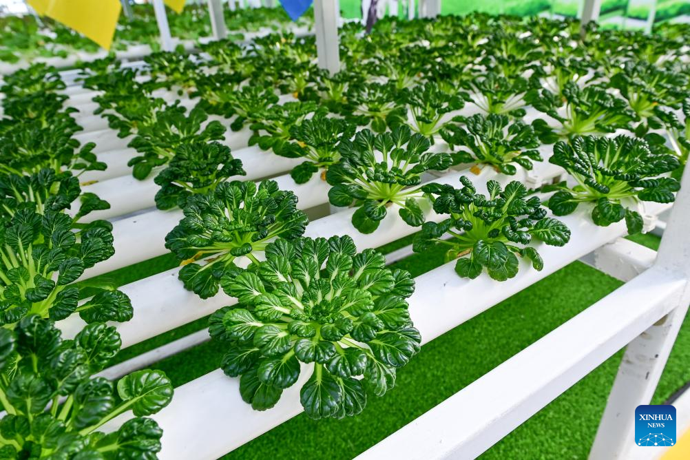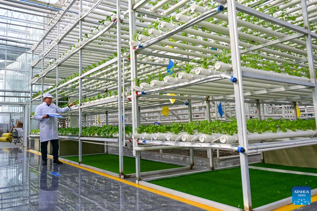 This photo taken on Feb. 10, 2025 shows plants growing at the center for future agricultural science and technology of an agricultural demonstration zone in Changji Hui Autonomous Prefecture, northwest China's Xinjiang Uygur Autonomous Region. In recent years, Xinjiang has attached great importance to the development of facility agriculture, including smart farming. As of 2023, the region had more than 1.2 million facility agriculture units, involving a vegetable plantation area exceeding 44,600 hectares in total, according to local department of agriculture and rural affairs. (Xinhua/Ding Lei)