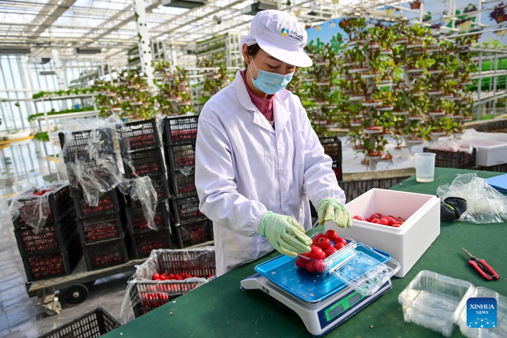 A staff member packs freshly picked tomatoes at the center for future agricultural science and technology of an agricultural demonstration zone in Changji Hui Autonomous Prefecture, northwest China's Xinjiang Uygur Autonomous Region, on Feb. 10, 2025. In recent years, Xinjiang has attached great importance to the development of facility agriculture, including smart farming. As of 2023, the region had more than 1.2 million facility agriculture units, involving a vegetable plantation area exceeding 44,600 hectares in total, according to local department of agriculture and rural affairs. (Xinhua/Ding Lei)