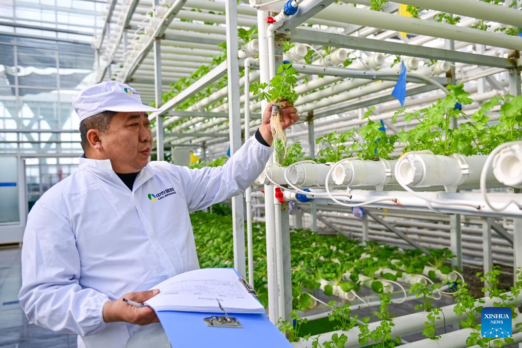 Senior agronomist Yan Ji checks the growth of vegetables at the center for future agricultural science and technology of an agricultural demonstration zone in Changji Hui Autonomous Prefecture, northwest China's Xinjiang Uygur Autonomous Region, Feb. 10, 2025. In recent years, Xinjiang has attached great importance to the development of facility agriculture, including smart farming. As of 2023, the region had more than 1.2 million facility agriculture units, involving a vegetable plantation area exceeding 44,600 hectares in total, according to local department of agriculture and rural affairs. (Xinhua/Ding Lei)