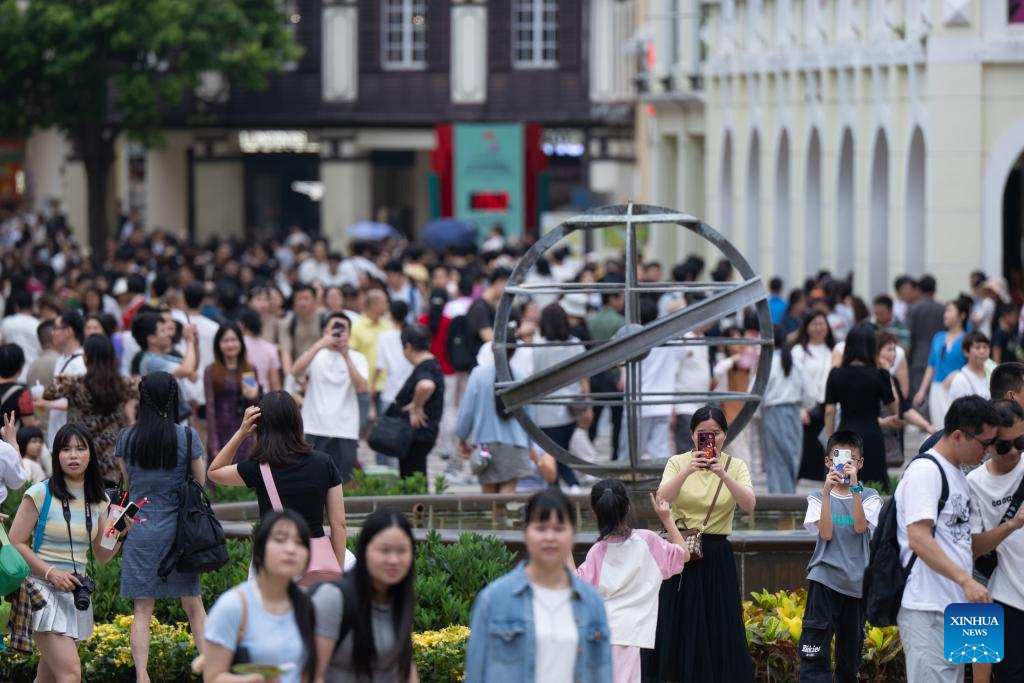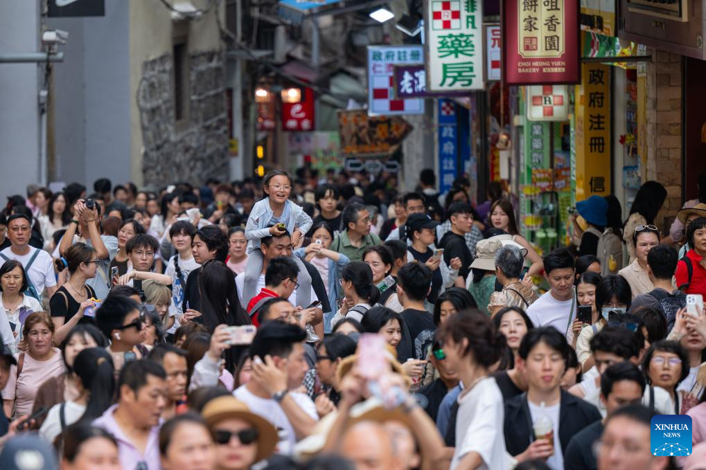 Tourists are pictured at the Senado Square in south China's Macao, May 1, 2025. The first three days of China's May Day holiday saw a significant influx of visitors to the Macao Special Administrative Region (SAR), injecting new vitality into the local tourism industry.