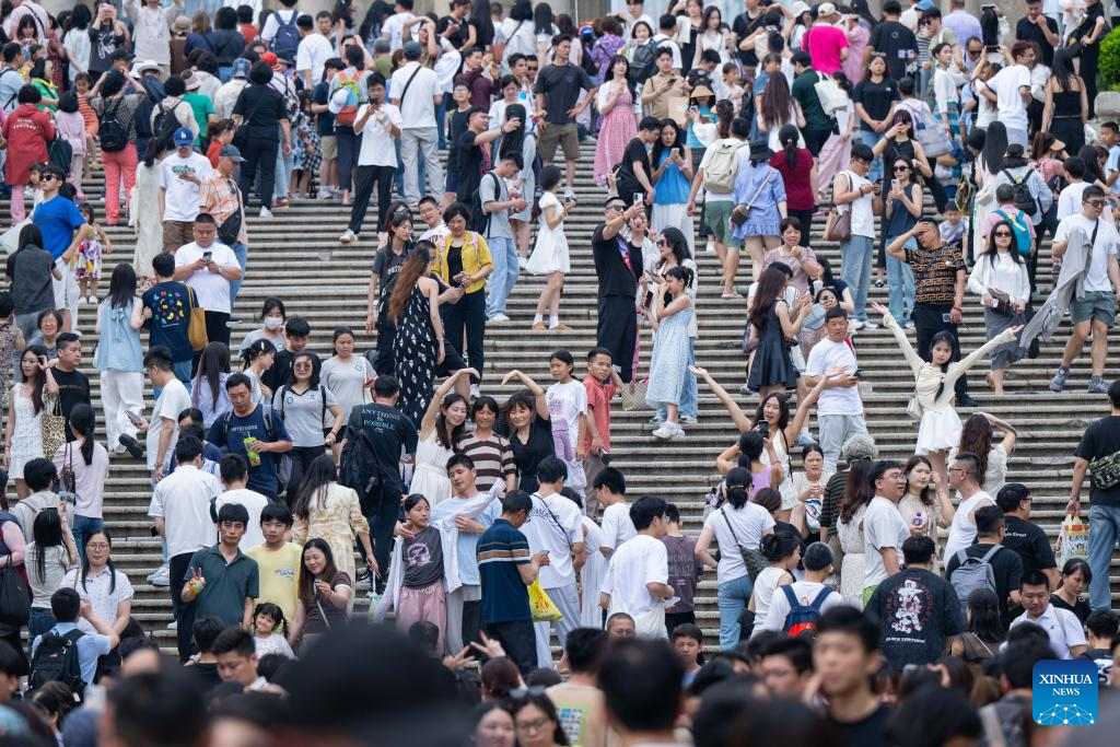 Tourists are pictured near the Ruins of St. Paul's in south China's Macao, May 3, 2025. The first three days of China's May Day holiday saw a significant influx of visitors to the Macao Special Administrative Region (SAR), injecting new vitality into the local tourism industry.