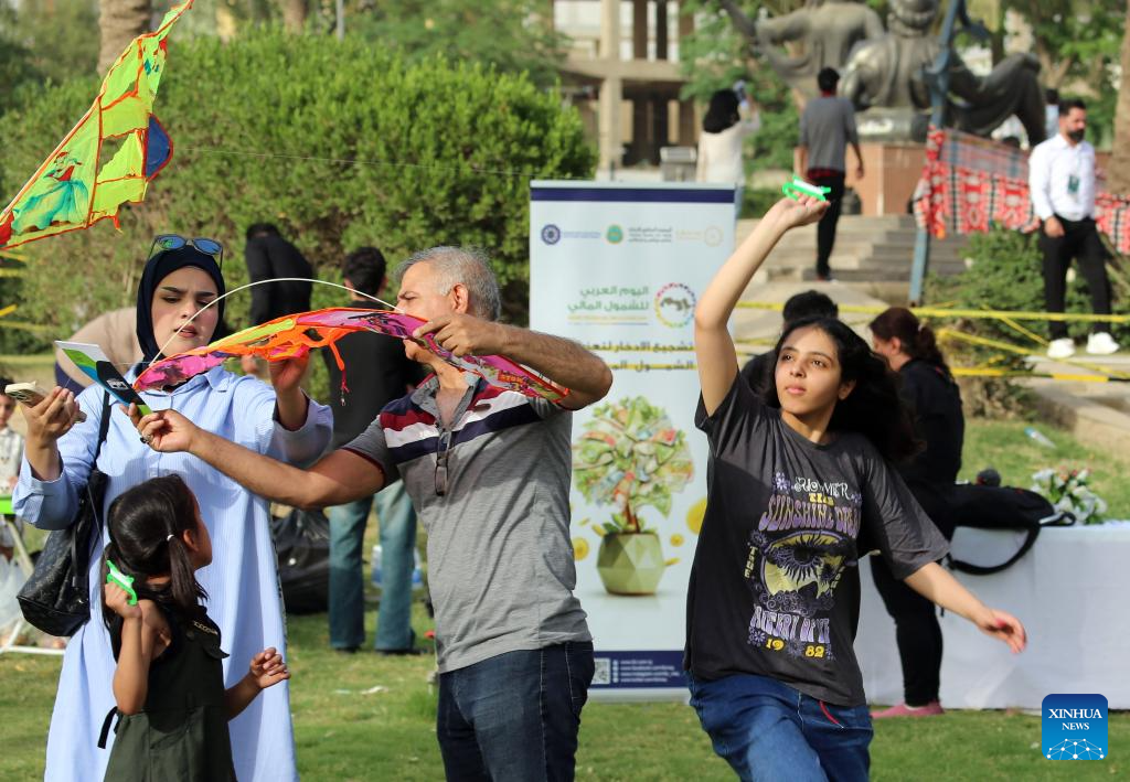 People have fun with their kites at the 8th Baghdad Kite Festival in Baghdad, Iraq, on May 3, 2025. The event kicked off on Saturday, attracting many locals. (Xinhua/Khalil Dawood)