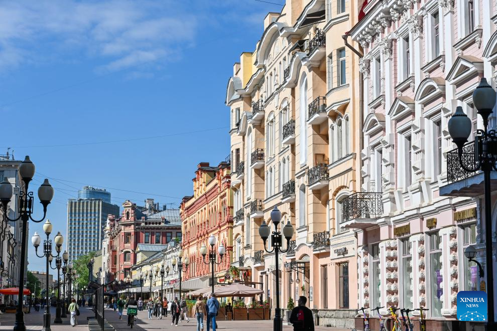 People are seen on the Old Arbat street in Moscow, Russia, April 25, 2025. (Xinhua/Cao Yang)