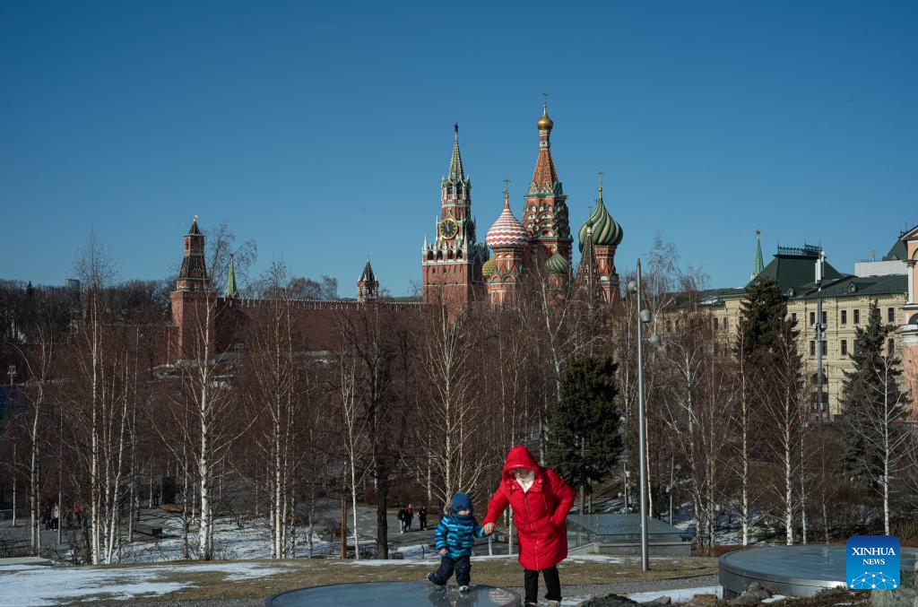 People walk by the Moscow River in Moscow, Russia, March 18, 2025. (Xinhua/Bai Xueqi)