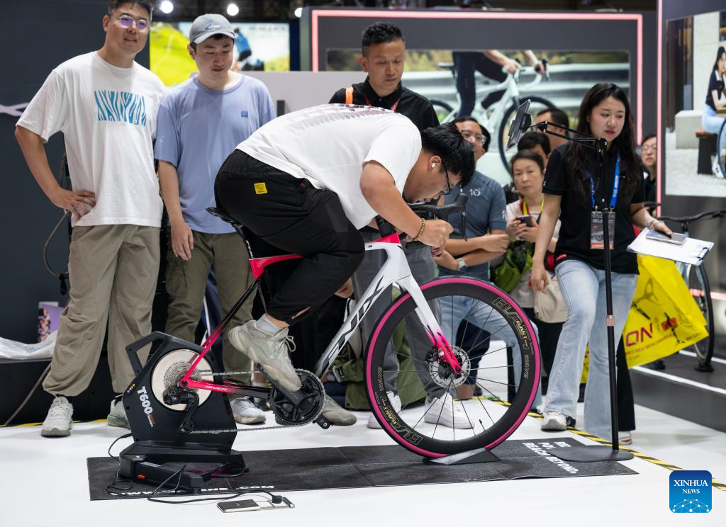 A visitor experiences a bicycle racing game during the 2025 China International Bicycle Fair in east China's Shanghai, May 5, 2025. The four-day 2025 China International Bicycle Fair kicked off at Shanghai New International Expo Centre on Monday, drawing nearly 1,600 enterprises from home and abroad to participate. (Xinhua/Cai Yang)