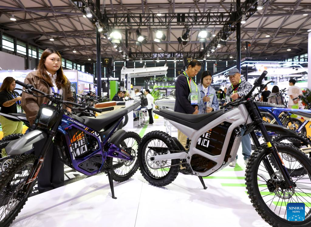 Visitors learn about electric motorcycles during the 2025 China International Bicycle Fair in east China's Shanghai, May 5, 2025. The four-day 2025 China International Bicycle Fair kicked off at Shanghai New International Expo Centre on Monday, drawing nearly 1,600 enterprises from home and abroad to participate. (Xinhua/Fang Zhe)