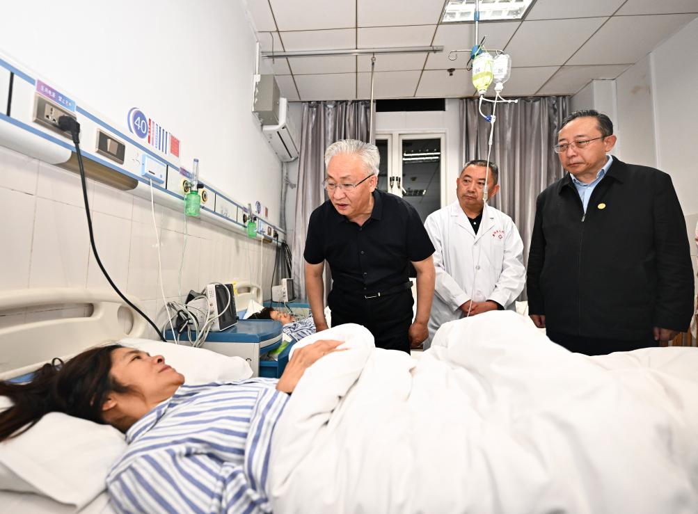 Chinese Vice Premier Zhang Guoqing, also a member of the Political Bureau of the Communist Party of China (CPC) Central Committee, visits a person injured in a boat capsize accident at a hospital in Qianxi City of Bijie, southwest China's Guizhou Province, May 5, 2025. Following General Secretary of the CPC Central Committee Xi Jinping's instructions and Premier Li Qiang's request, Zhang led a team to the site on May 4 to guide the rescue and relief work. (Xinhua/Yan Yan)